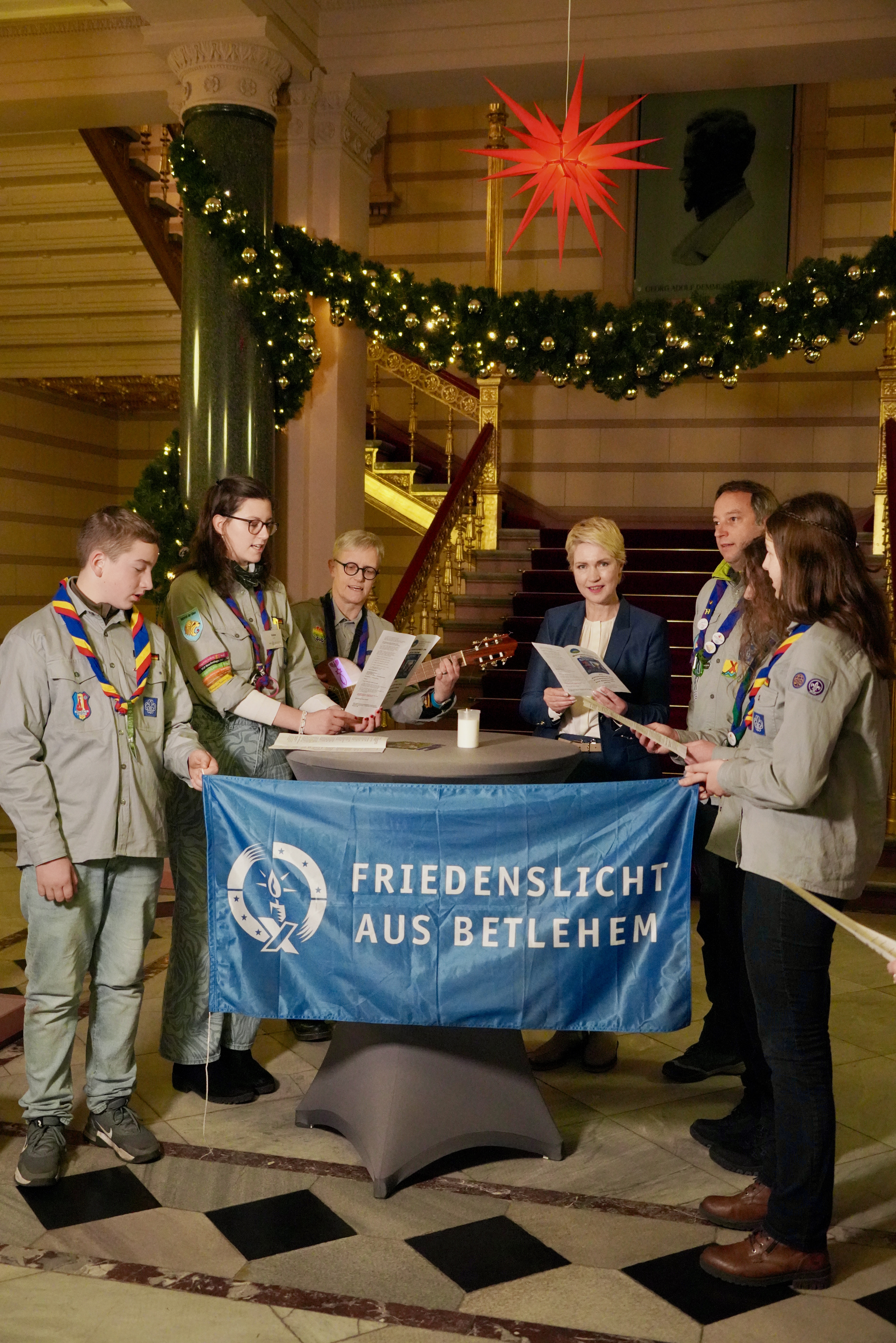 Am 16. Dezember um 16:00 Uhr werden Pfadfinder*innen das Friedenslicht an Ministerpräsidentin Manuela Schwesig in der Staatskanzlei in Schwerin übergeben. (treffen 15 Minuten vorher vor der Staatskanzlei).